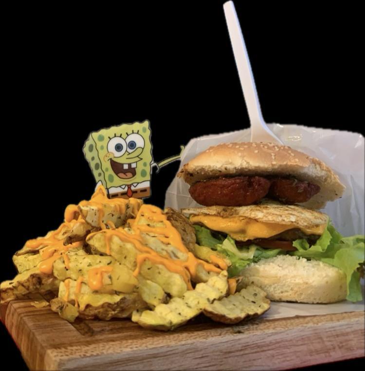 Pan crujiente, carne, queso cheddar, salsa de tocino de la casa, tocino ahumado y papas.